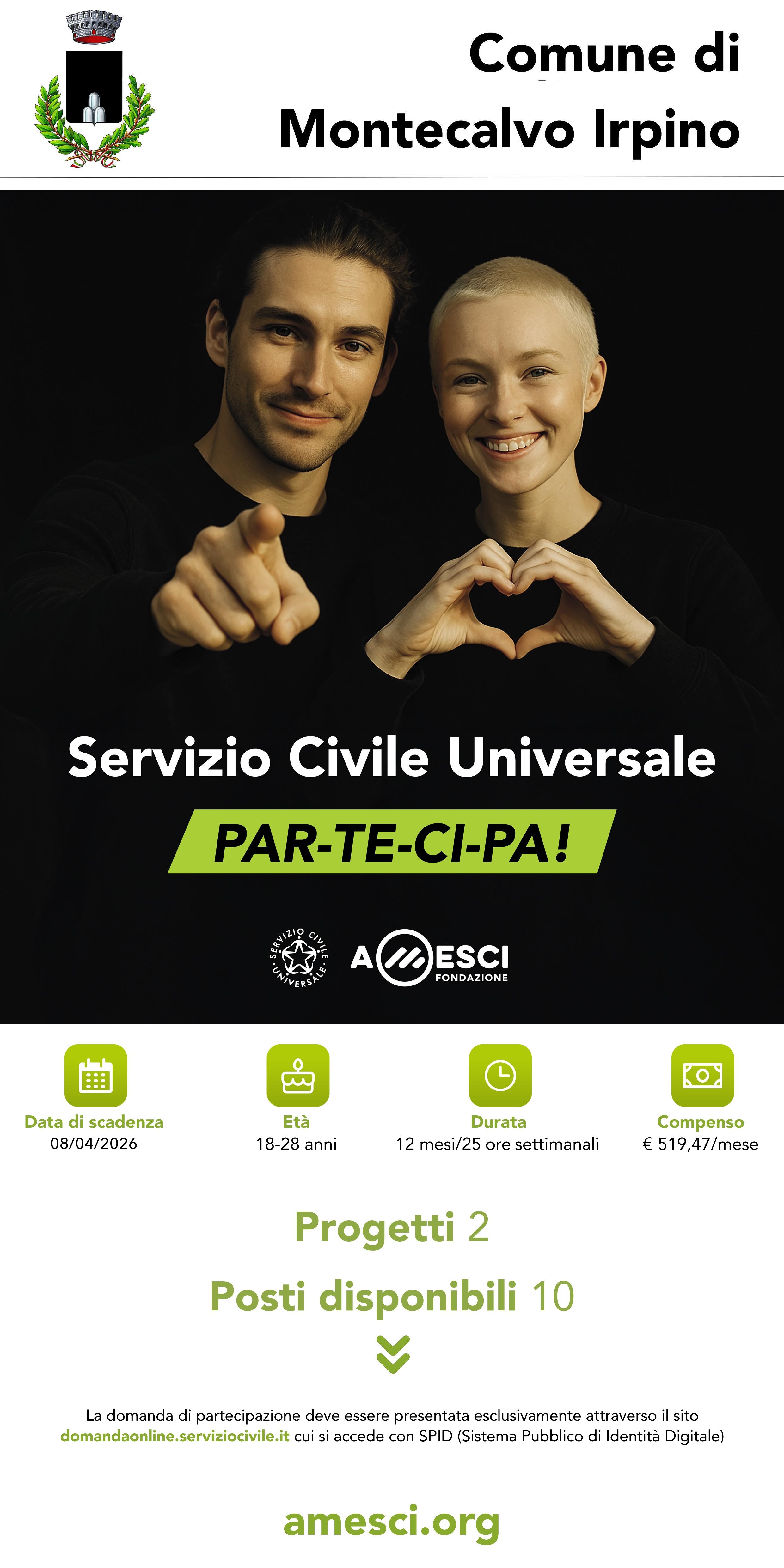 - Calendario delle selezioni Comune di Montecalvo Irpino Bando per la selezione di 62.549 operatori volontari da impiegare in progetti afferenti a programmi di intervento di Servizio civile universale da realizzarsi in Italia e all'estero del 18/12/2024
